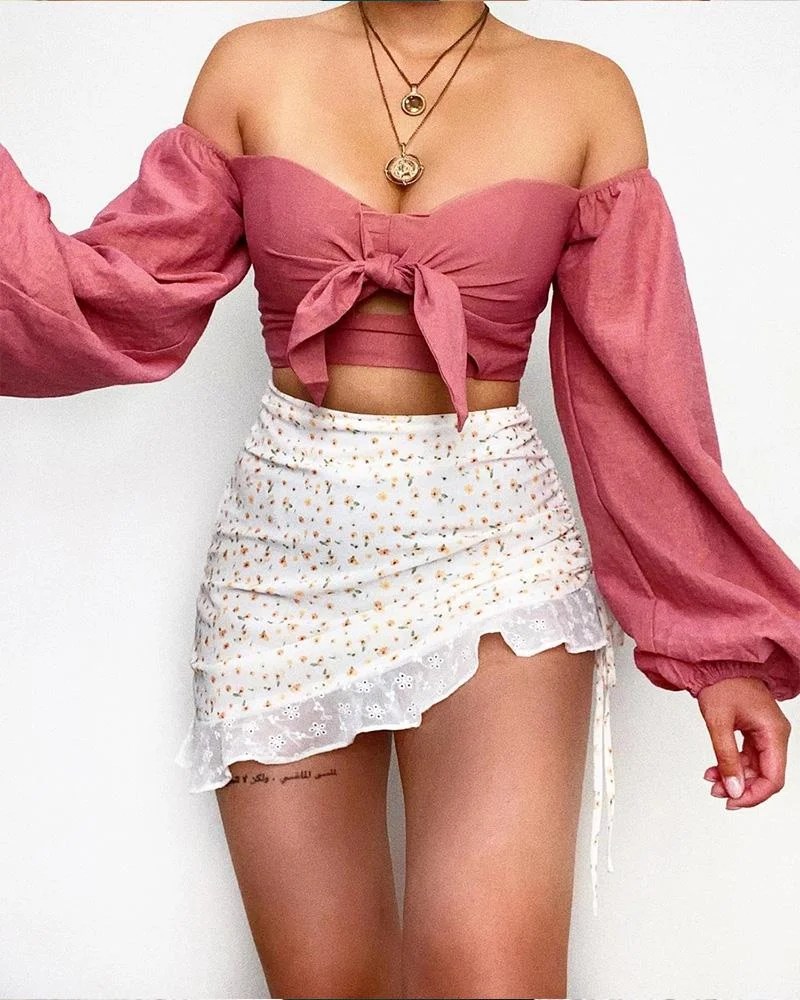 Off Shoulder Crop Top & Ditsy Floral Print Drawstring Skirt SetStyle:Casual,Chic